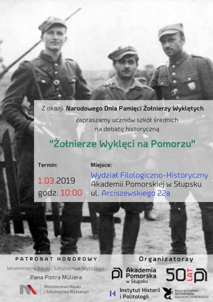 Z okazji Narodowego Dnia Pamięci Żołnierzy Wyklętych w dniu 1 marca 2019 r. o godz. 10.00, w holu Wydziału Filologiczno-Historycznego Akademii Pomorskiej w Słupsku odbędzie się debata historyczna połączona z otwarciem okolicznościowej wystawy. Wydarzenie zostało objęte honorowym patronatem posła Piotra Müllera, wiceministra Nauki i Szkolnictwa Wyższego.