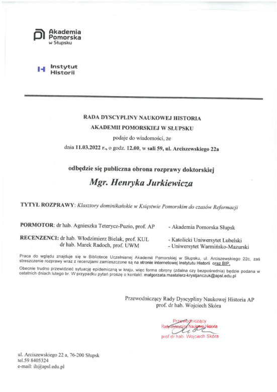 8 lutego 2022, 12:28Ogłoszenie o obronieDnia 11.03.2022 r. odbędzie się publiczna obrona rozprawy doktorskiej Mgr. Henryka Jurkiewicza. Streszczenie ang polski Henryk Jurkiewicz Praca doktorska Klasztory Dominikanskie w Księstwie Pomorskim do czasów Refo_1.docx Henryk Jurkiewicz - recenzja.pdf Henryk_Jurkiewicz (1)-recenzja.pdf