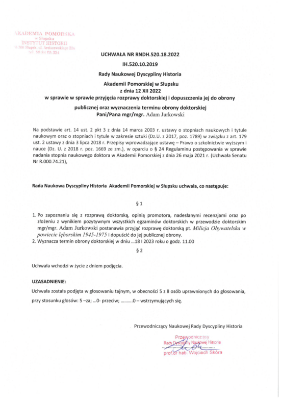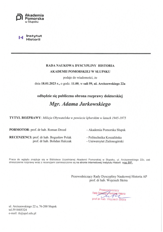 13 stycznia 2023, 08:04Publiczna obrona pracy doktorskiej mgr. Adama JurkowskiegoTytuł rozprawy: Milicja Obywatelska w powiecie lęborskim w latach 1945-1975 SKM_C284e22121413310 (1).pdf SKM_C284e22121413320 (1).pdf Jurkowski milicja streszczenie - English version of Citizens' Militia abstract.pdf Jurkowski milicja streszczenie Polska wersja.pdf