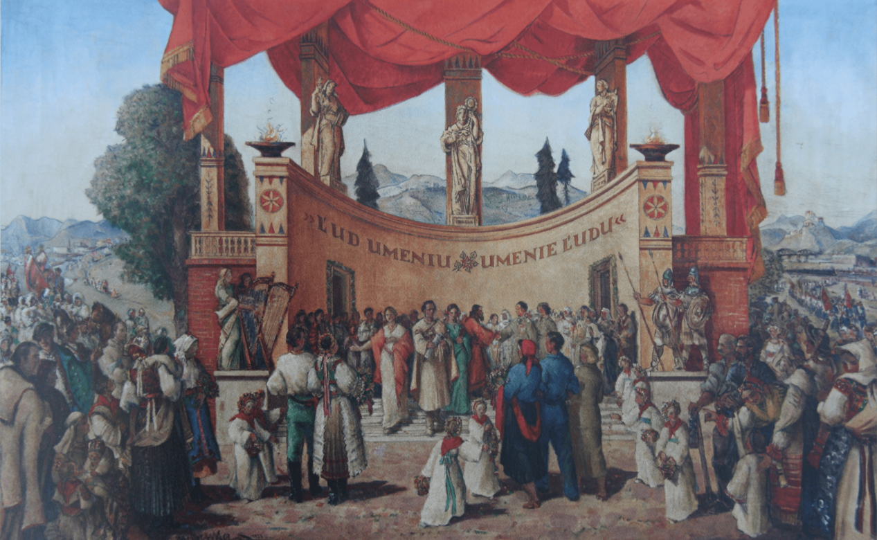2. Martin Benka, projekt kurtyny dla Teatru Narodowego w Bratysławie, Lud sztuce – sztuka ludowi – (Lud umieniu – umenie ludu), 1951-1952. olej/ płótno, 81 x 130; Muzeum Martina Benki w Martinie, repr. za: Alexandra KUSÁ, Prerušená pieseň. Vytnarne umenie v časoch stalinkiej kulturnej praxe 1948-1956, Bratislava 2019, s. 501.